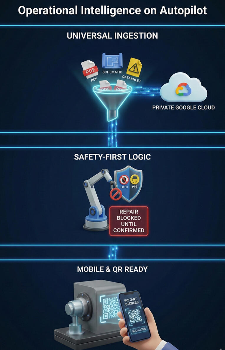 We upload your legacy PDFs, electrical schematics, and safety datasheets into a private, secure Google Cloud environment.Feature 2: Safety-First Logic